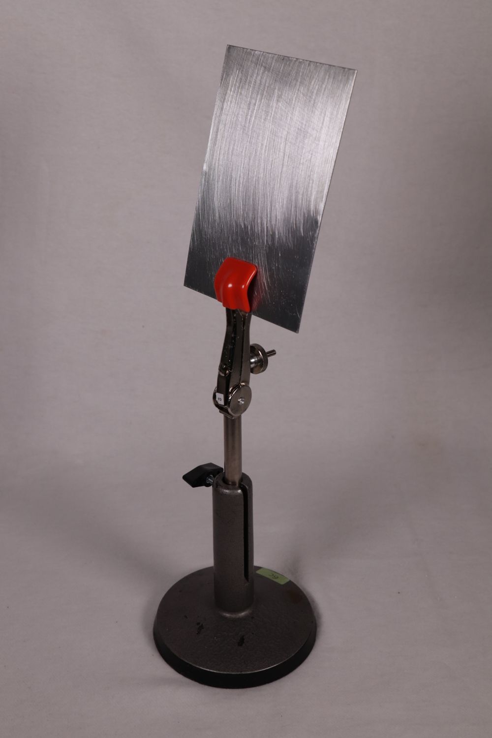 - Befestige die Stativklemme in dem zweiten Stativfuß und klemme die Zinkplatte in die Stativkleme ein, wie in der Abbildung rechts zu sehen. Gegebenenfalls muss die von der UV-Lampe bestrahlte Seite der Zinkplatte vor Versuchsbeginn mithilfe eines Schleifpapiers abgeschliffen werden, um die Oxidationsschicht zu entfernen. Positioniere die Zinkplatte so, dass sie von der UV-Lampe gut bestrahlt wird.