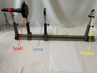# Achte darauf, dass der Abstand zwischen Spalt und Linse (f=150 mm) ungefähr der Brennweite der Linse entspricht, d.h. '''ca. 15 cm'''! Der Abstand zwischen Linse und Prisma ist nicht entscheidend.