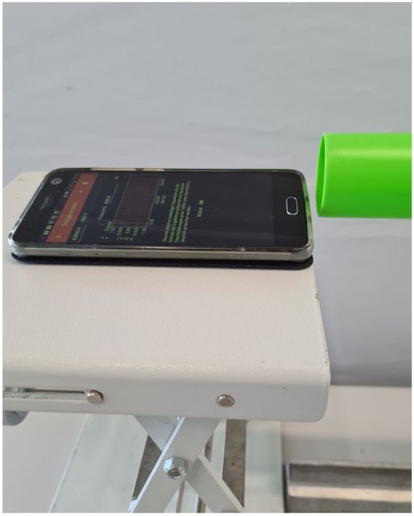 ; Schritt 2: | ; Schritt 2: Das verwendete Smartphone wird mithilfe einer Laborhebebühne auf die gleiche Höhe gebracht wie der Boomwhacker und das Mikrofon. Der Lautsprecher des Smartphones muss dabei direkt vor dem Eingang des Boomwhackers liegen. | ||