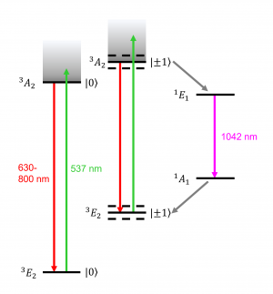 NV-Zentren sind Fehlstellen im Gitter von Diamanten. Bei diesen wird jeweils ein Kohlenstoffatom im tetraedrischen Gitter des Diamanten durch ein Stickstoffatom (engl. nitrogen) und eine Leerstelle (engl. vacancy) ersetzt (Abb. ). Je nach Anzahl der beteiligten Elektronen lässt sich zwischen NV0-Zentrum und NV- -Zentrum unterscheiden. Das NV- Zentrum weist ein zusätzliches aufgenommenes Elektron auf und zeigt dadurch eine Fluoreszenz, anhand der verschiedene Quantenphysikalische Effektte untersucht werden können. Das NV- Schema soll daher in diesem Artikel im Fokus stehen. Das Termschema zeigt zum einen Grundzustand 3A2 |0> und den angeregten Zustand 3E |0>. Bei Bestrahlung des NV-Zentrums mit Photonen einer Wellenlänge von 532 nm – zum Beispiel durch grünes Laserlicht – wird dieses zunächst in höhere vibronische Zustände des 3E |0> Zustands versetzt. Nach Verlust eines Teils der Energie kann das NV-Zentrum vom 3E |0> Zustand wieder in den Grundzustand fallen, wobei Photonen mit einer Wellenlänge von 600-830 nm abgegeben werden. Hierdurch kommt es zur charakteristischen roten Fluoreszenz des NV-Zentrums, welche auch für die rötliche Färbung mancher natürlich vorkommenden Diamanten verantwortlich ist. Der Grundzustand und angeregte Zustand verfügen jeweils über zusätzliche Spinzustände 3A2 |+-1> und 3E |+-1>. In diesen mit Spin |0>. Die Energien der |+-1> Zustände sind jeweils gegenüber den Spin |0> Zuständen nach oben verschoben, das NV-Zentrum kann zwischen diesen jedoch den gleichen Fluoreszenzübergang vollziehen. Die |+-1> Zustände sind in Abwesenheit eines äußeren Magnetfelds entartet, spalten sich im Magnetfeld jedoch entsprechend des Zeeman-Effekts auf.
