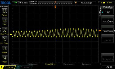 Nach der Einstellung des Direktmischers wird am Oszilloskop die Schwebungsfrequenz im Ruhezustand dargestellt. Für die Versuchsdurchführung wird das Pendel in Schwingung versetzt. Die Schwebungsfrequenz wird niedriger, wenn sich das Pendel von der Ultraschallsensorik entfernt. Auf der anderen Seite steigt die Frequenz, wenn sich das Pendel auf die Schallquelle zubewegt. Die minimale Frequenz beträgt in diesem Fall fmin = 476Hz und die maximale Frequenz fmax = 526 Hz. Es wird davon ausgegangen, dass das Pendel nur schwach gedämpft wird. Damit ist der Betrag der Geschwindigkeit des Schirms in beide Bewegungsrichtungen gleich groß.
