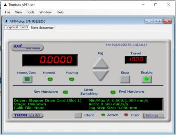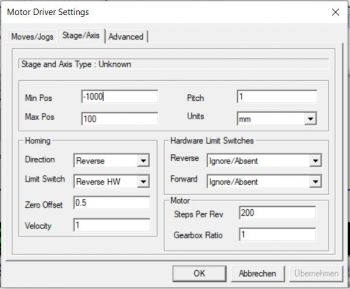 • Die meisten Schwierigkeiten traten bei den verwendeten Geräten und Software auf. Hier muss darauf geachtet werden, dass Bauteile einheitlich sind (metrische Gewinde) und der korrekte Motor Controller für die passende Stage genommen wird. Für die APT Software sollte man sich an die Thorlabs Anleitung halten.