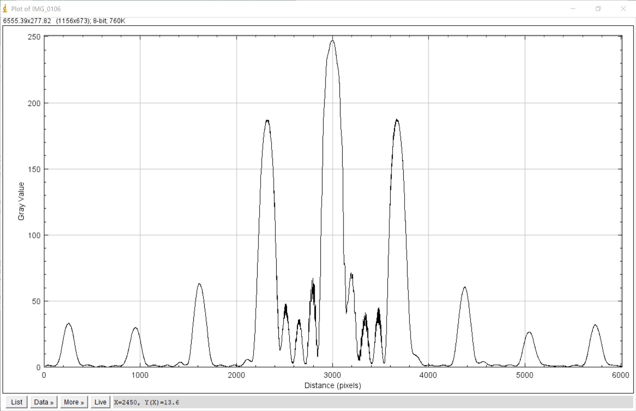 Datei:EXP Schwingungen und Wellen Interfenzmuster Gitter n5 g250µm a1233mm Grauwerte.jpg