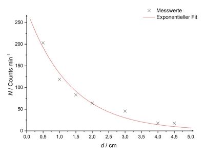 Außerdem wurde ein exponentieller Fit der Form an die Messwerte angepasst. Dabei ergab sich als Fitparameter , was dem linearen Abschwächungskoeffizienten für Blei entspricht.