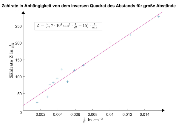 In der folgenden Auswertung wurden die Messwerte für den Abstand invers-quadriert aufgetragen. Dies erlaubt es einen einfachen grafischen Zugang zur Lösung der Fragestellung zu finden. Die Nullrate ist bereits abgezogen.
