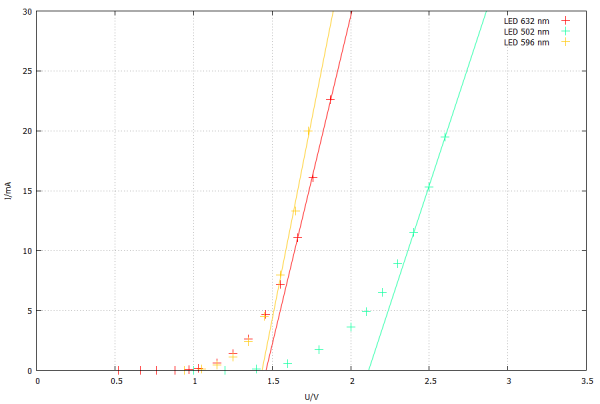 Mit den Schwellenspannungen und Frequenzen der einzelnen Dioden und der Elementarladung kann damit das Planck’sche Wirkungsquantum berechnet werden.