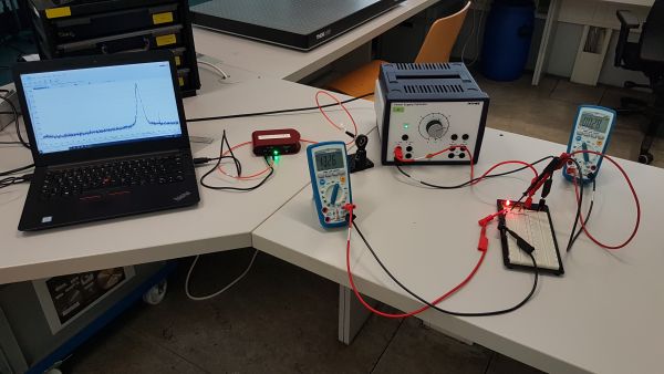 Nachdem genügend Messwerte aufgenommen wurden, wird mit dem Spektrometer die Wellenlänge der LED bestimmt. Die Wellenlänge kann mit der Thorlabs Software direkt aus dem Spektrum oder mithilfe der Funktion „Peak“ ausgelesen werden.