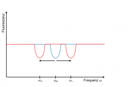Schematische Darstellung eines ODMR-Messergebnisses. Durch die fehlende Fluoresezenz des Singulett-Übergangs ergibt sich bei Bestrahlung mit Mikrowellen der Resonanzfrequenz ein Einbruch der Fluoreszenz (blaue Kurve). Bei Anwesenheit eines externen Magnetfelds spaltet das Minimum in zwei Minima auf (rote Kurve).