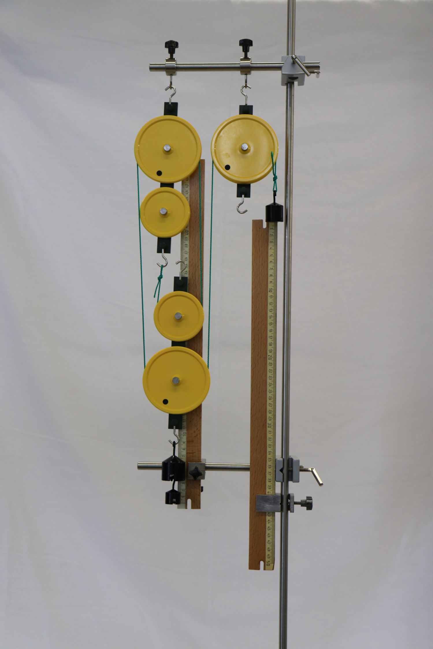 Abb.2: Aufbau eines Flaschenzugs bestehend aus zwei losen und zwei festen Rollen. Demonstration der Massenänderung.