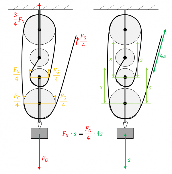 Mithilfe eines Flaschenzugs soll eine Masse m eine Strecke Δs nach oben gezogen werden. Besteht der Flaschenzug im einfachsten Fall nur aus einer befestigten Umlenkrolle, so wird die dafür nötige Kraft mit einem Seil über die Umlenkrolle nur in eine andere Richtung umgeleitet. Der Betracht der benötigten Kraft bleibt konstant. Das Massestück wird um genau die Strecke Δs angehoben, die auch an dem Seil gezogen wird. Die Goldenen Regel der Mechanik als das Produkt aus FΔs bleibt also konstant.