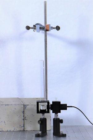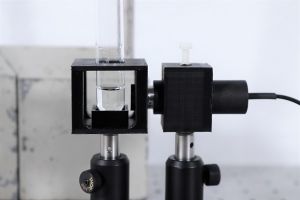 - Als erstes werden das Reagenzglas und das Zählrohr fest auf dem Breadboard montiert. Über dem Reagenzglas werden Stativstangen und eine Klemme so angebracht, dass später der Isotopengenerator eingespannt werden kann. Die Schutzkappe auf dem Zählrohr muss nicht abgenommen werden, da in diesem Versuch γ-Strahlung gemessen wird.