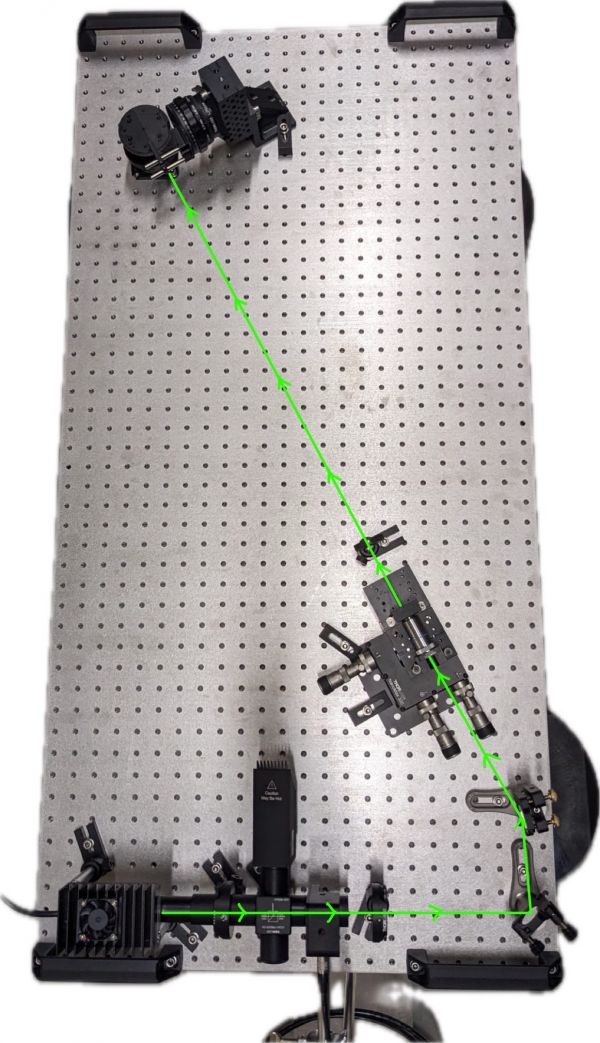Im Folgenden wird der Gesamtaufbau der Optik genauer erläutert. Generell ist es wichtig beim Aufbau darauf zu achten, dass zwischen Linse und Objekt ein möglichst großer Abstand vorhanden ist, sodass der Laserstrahl-Durchmesser maximal ist und so ein möglichst großer Bereich (optimal die gesamte Fotoplatte) ausgeleuchtet wird. Der Abstand zwischen Pinhole und Objekt beträgt in diesem Experiment 70 cm.