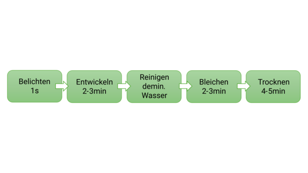 Das Entwickeln und Bleichen der Platte muss ebenfalls in der Dunkelkammer erfolgen. Hierzu werden drei Kristallisationsschalen vorbereitet, wobei in die erste Schale die Entwicklerlösung eingefüllt wird, in die zweite demineralisiertes Wasser zum Reinigen und in die dritte die Bleichlösung. Die Lösungen sollen die Platte vollständig benetzten und werden daher jeweils zu etwa 0,5 cm hoch befüllt. Die belichtete Platte wird zuerst mithilfe einer Zange für 2-3 Minuten in die Entwicklerlösung gegeben und immer wieder leicht geschwenkt. Dabei wird die gesamte Platte dunkel. Anschließend wird in der Schale mit demineralisiertem Wasser die Entwicklerlösung abgewaschen, danach die Fotoplatte in das Bleichbad gegeben und ebenfalls für 2-3 Minuten geschwenkt. Hierbei sollte sich die Platte wieder entfärben. Ist dies geschehen, kann das Licht wieder eingeschaltet werden.