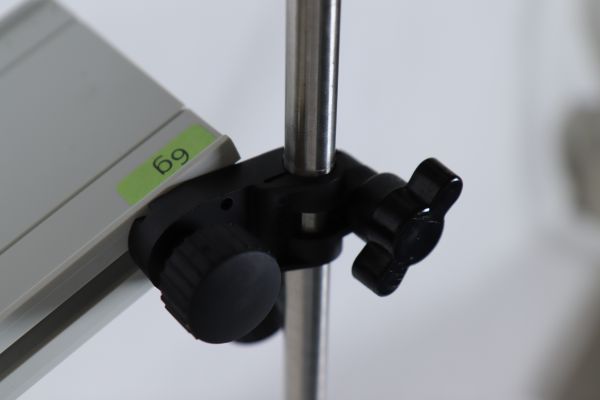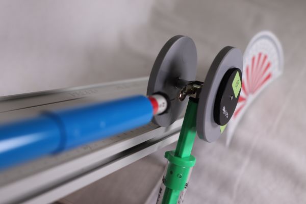 - Zuerst werden die beiden Stativstangen an den beiden Stativfüßen befestigt. Die Fahrbahn wird dann mithilfe von einer Befestigung an der linken Stativstange so befestigt, dass ein Ende der Fahrbahn die Tischplatte berührt. Zusätzlich wird eine Halterung seitlich an der Fahrbahn befestigt um daran einen Federkraftmesser zu befestigen.