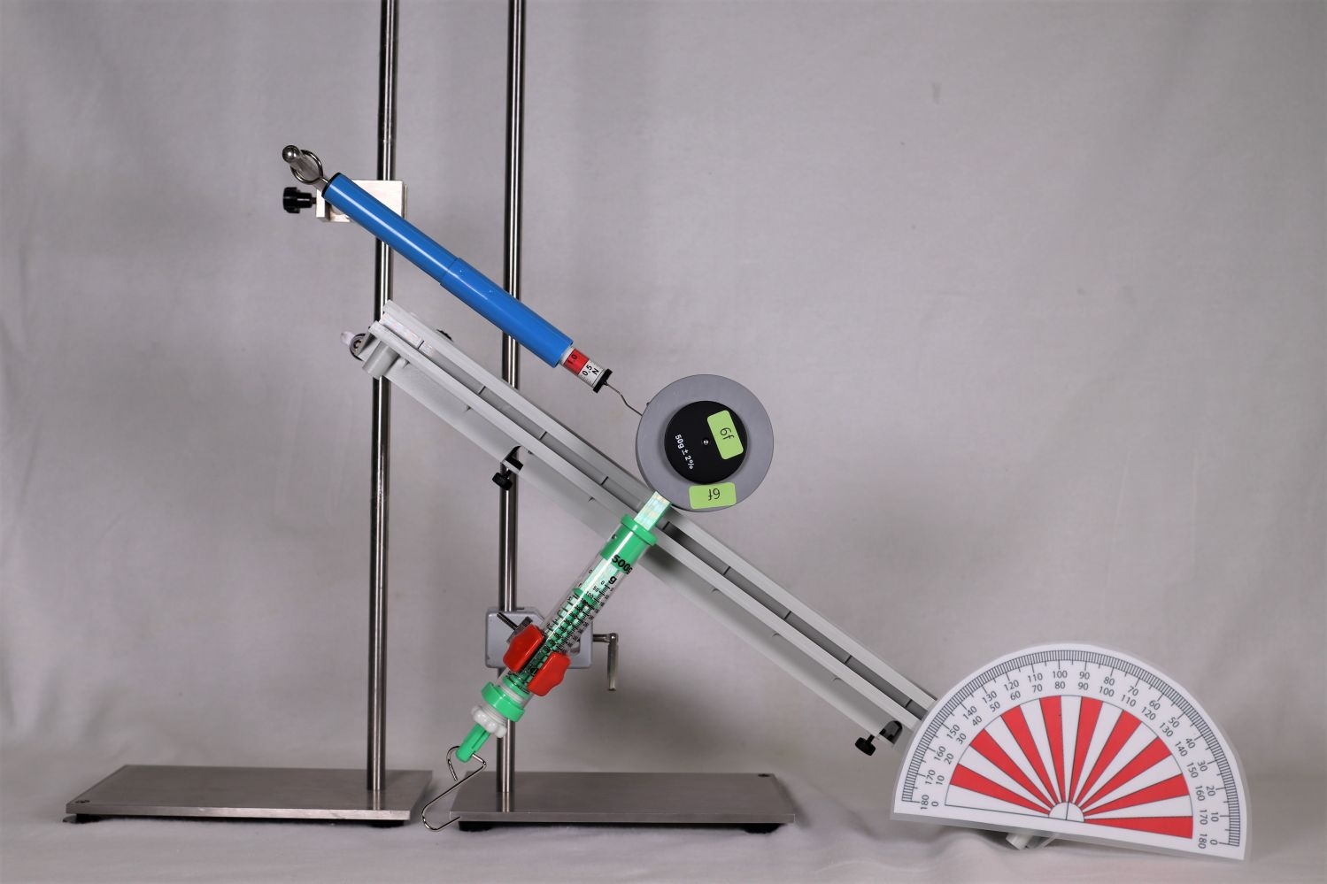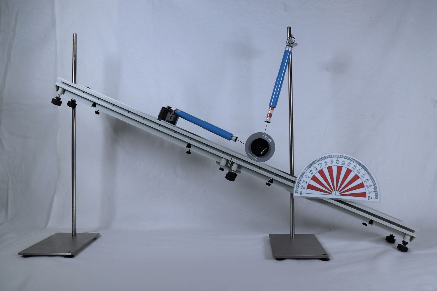 Gesamter Aufbau zur Kräftezerlegung an der schiefen Ebene.
