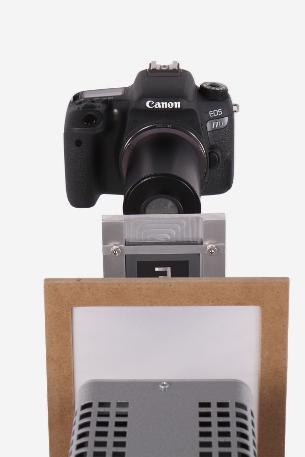 Beim Verschieben der Kamera auf der optischen Bank ergeben sich je nach Abstand zum Dia unterschiedliche Bildausschnitte, weshalb der Abstand so gewählt wird, dass das ganze Dia durch den Live-View-Modus der Kamera zu sehen ist. Hier ergaben sich somit eine Bildweite, die von der Blendenöffnung bis zur Sensormarkierung an der Kamera gemessen wird, von 127 mm und eine Gegenstandsweite von 195 mm.