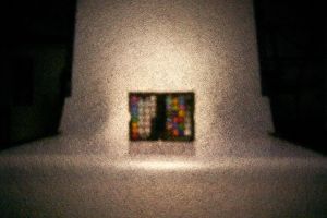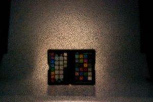 Bei einem ersten Test hat sich gezeigt, dass nur sehr helle Gegenstände auf dem Schirm der Lochkamera zu sehen sind. So lässt sich zum Beispiel nur eine eingeschaltete Deckenlampe und die Sonne bei leicht bewöktem Himmel erkennen. Für das Experiment wurde daher eine Farbpalette auf einen Aufnahmetisch gestellt und mit zwei Studioblitzen beleuchtet. Hierbei wurden beide Blitze (200 Ws und 300 Ws) bei voller Leistung betrieben und an der Kamera ein ISO-Wert von 6400 bei einer Blende von f/5 eingestellt. Wegen des sehr dunklen Kameradisplays wurden ein paar Testaufnahmen zur Ausrichtung der Lochkamera genommen. Anschließend wurde bei unterschiedlichen Abständen zwischen Lochblende und Schirm der Schirm der Lochkamera abfotografiert.