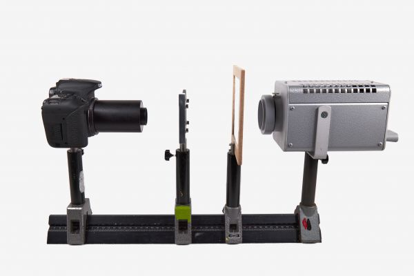 - Die Reiter für die Kamera, die Diahalterung, das Diffusortuch und die Lampe werden auf der optischen Bank angebracht.