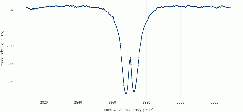 Wird statt der kontinuierlichen Messung eine zeitliche begrenzte Messung verwendet, so kann es passieren, dass während der Messung bei geringeren Mikrowellenfrequenzen noch nicht alle NV-Zentren im Grundzustand präpariert sind. Als Resultat lässt sich bei niedrigen Frequenzen eine abnehmende Fluoreszenz beobachten. Um dies zu verhindern, sollte wie oben beschrieben der kontinuierliche Messmodus verwendet werden.