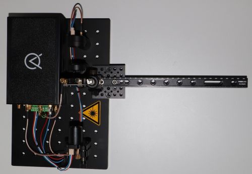 Der im Versuchsaufbau von Advanced Quantum GmbH verwendete Laser weist eine weitaus größere Leistung als der im ersten Versuch verwendete Laser auf. Es ist also bei diesem Versuch noch wichtiger, sicherzustellen, dass die Schülerinnen und Schüler nicht in den Strahl schauen können.
