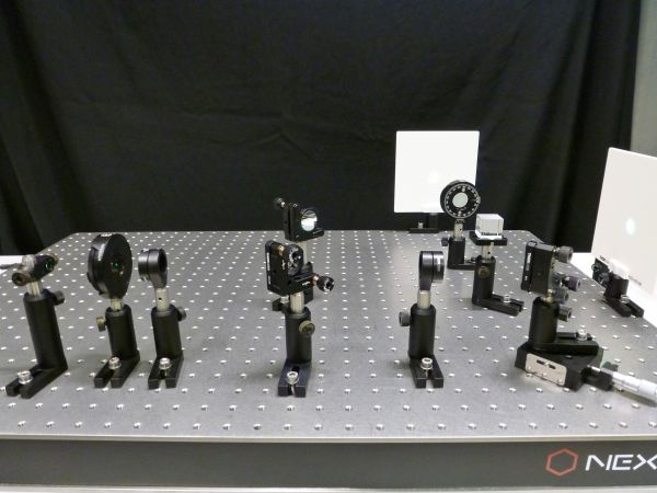 Zunächst wird ein Mach-Zehnder-Interferometer aus Laser, 2 Spiegeln, 2 Strahlteilern und 2 Schirmen aufgebaut. Dabei wird einer der Spiegel auf eine Stage gebaut, damit er minimal verschoben werden kann, um ein besseres Interferenzbild zu erhalten.