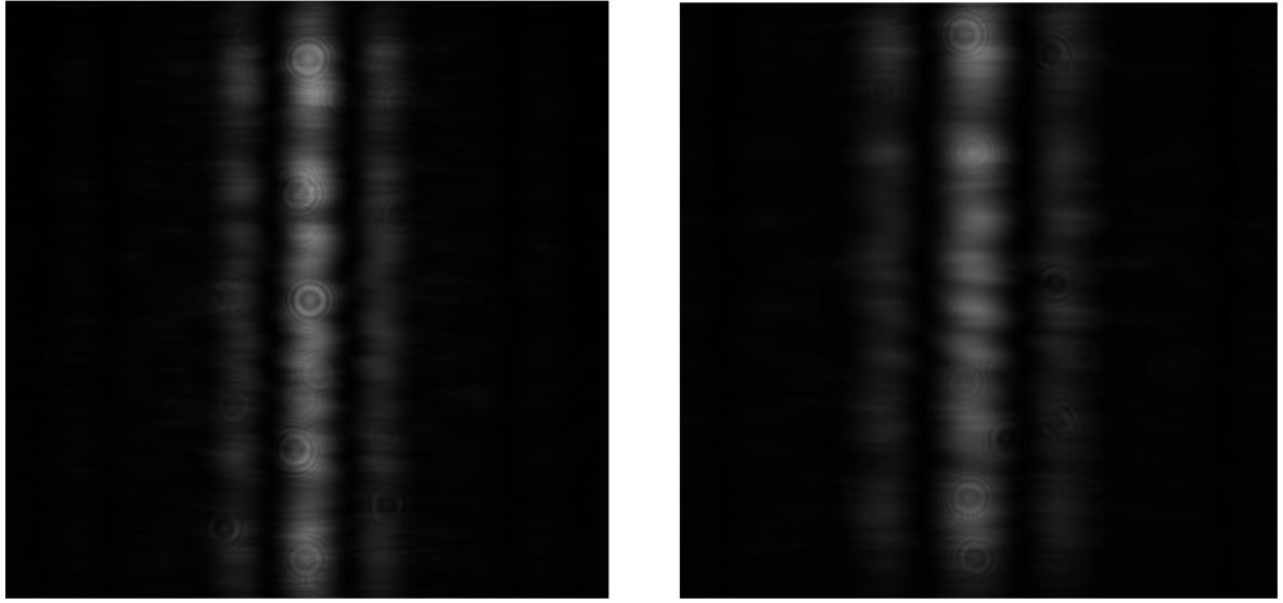In den Abbildungen 6-10 wird der Talbot-Effekt genauer untersucht. Bei einer Entfernung von 1,5 cm ist noch die Abbildung des Doppelspalts, also zwei große Intensitätsmaxima zu erkennen. Allerdings treten bereits intensitätsschwächere Nebenmaxima auf, wie in Abbildung 6 im linken Bild zu erkennen ist. In Abbildung 6 ist rechts das Beugungsbild bei einem Gitter-Kamera-Abstand von 6 cm, was ungefähr einem Viertel der Talbot-Länge entspricht, dargestellt. Hier verdoppelt sich die Anzahl der Intensitätsmaxima auf vier und anstatt dem vorherigen Minimum liegt ein Maximum im Zentrum des Beugungsbilds. Bei einem Drittel der Talbot-Länge, also bei einem Abstand von 8 cm, sollte sich die Anzahl der Intensitätsmaxima verdreifacht haben. Dies lässt sich im linken Bild in Abbildung 7 allerdings nur erahnen und nicht eindeutig nachweisen. Daraus folgt, dass ein Abstand von 8 cm nicht genau einem Drittel der Talbot-Länge entspricht. Allerdings ist, wie zu erwarten, erneut ein Maximum im Zentrum der Intensitätsverteilung zu erkennen. Im rechten Bild in Abbildung 7 ist das Beugungsbild bei der halben Talbot-Länge abgebildet. Dies entspricht einem Gitter-Kamera-Abstand von 12 cm. Wie zu erwarten ist das Negativbild des Doppelspalts in Abbildung 6 links, also zwei klare Minima, sichtbar. Bei der Talbot-Länge von ca. 24 cm wird die Intensitätsverteilung in Abbildung 8 links aufgezeichnet. Zu erwarten wären zwei deutliche Intensitätsmaxima, die das Abbild des Doppelspalts bilden. Dies ist allerdings nicht erkennbar. Stattdessen ähnelt das Beugungsbild der Fernfeld-Aufzeichnung aus Abbildung 8 rechts bei einem Abstand von 30 cm. Deshalb wird davon ausgegangen, dass hier bereits das Interferenzmuster des Fernfelds zu erkennen ist. Bei weiterer Vergrößerung der Entfernung ändert sich die Intensitätsverteilung kaum noch.