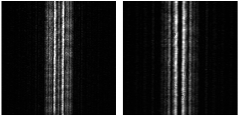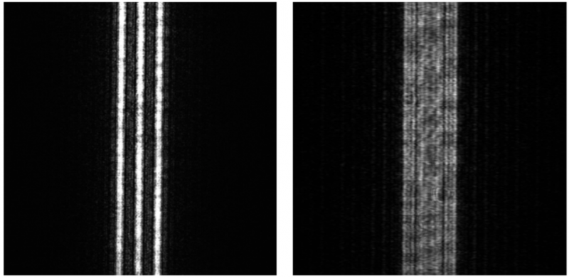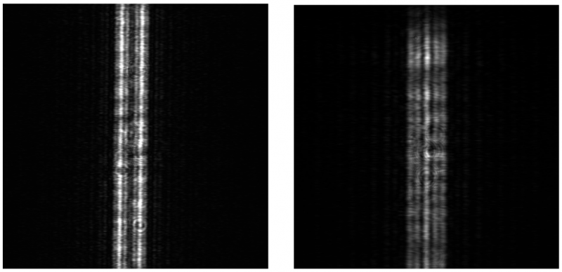 Als erstes wird der Laser eingeschaltet und die Messung wird mit dem Aufbau in Abbildung 3 durchgeführt. Dabei wird die CCD-Kamera auf der Translation Stage, die so nah wie möglich vor dem Gitter positioniert wurde, in 1 mm Abständen von dem Gitter weg bewegt, bis das Ende der Stage erreicht wird. Bei der Wahl des Gitters kann ein Doppelspalt, ein Dreifachspalt, ein Vierfachspalt oder ein Gitter verwendet werden. Für eindeutige Ergebnisse wird empfohlen, einen Doppel- oder Dreifachspalt zu verwenden. Sobald die CCD-Kamera um 1 mm von dem Gitter entfernt wurde, wird mit der ASICap-Funktion in ASIStudio ein Bild gespeichert. Für einen deutlichen Kontrast sollten die Exposure auf 32 μs und der Gain auf 0 gestellt werden. Damit man den ganzen Bereich und den Übergang vom Nah- zum Fernfeld beobachten kann, wird die Translation Stage mit der optischen Bank ausgetauscht. Erneut wird die Kamera so nah wie möglich vor dem Gitter positioniert und in 0,5 cm Schritten von dem Gitter wegbewegt. Genauso wie zuvor wird das auf dem Laptop zu sehende Beugungsbild mit ASICap aufgezeichnet.