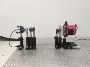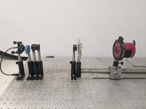Laser, Polarisationsfilter, erste Linse, Lochblende, zweite Linse und Gitterhalterung werden in dieser Reihenfolge in einer Höhe und Linie auf einem optischen Tisch befestigt. Dabei wird mit den Linsen begonnen, die so eingestellt werden, dass der Laserstrahl möglichst parallel ist. Die erste Linse dient der Aufweitung des Strahls und sollte eine geringe Brennweite haben. Die zweite Linse dient dazu, den divergenten Laserstrahl zur Parallelität zu bringen. Ob der entstehende Laserstrahl parallel ist, kann überprüft werden, indem der Durchmesser des Laserstrahls nahe hinter der zweiten Linse mit dem Durchmesser in größerer Entfernung (einige Meter) verglichen wird. Der Durchmesser sollte sich nicht mit steigender Entfernung möglichst nicht verändern. Zur Justierung können die Abstände zwischen den Linsen sowie deren Brennweiten verändert werden. Anschließend kann die Lochblende hinter der ersten Linse in den Brennpunkt des Laserstrahls positioniert werden. Direkt hinter der zweiten Linse kann die Gitterhalterung befestigt werden. Der Intensitätsfilter wird nur bei sehr empfindlichen Kameras benötigt, und kann irgendwo in den Strahlengang gesetzt werden. Es eignet sich, den Aufbau möglichst klein zu halten, da dann mehr Platz zur Verschiebung der Kamera besteht. Die Kamera selbst kann entweder auf einer Translation Stage (Abbildung 3) oder einer optischen Bank (Abbildung 4) befestigt werden. Die Translation Stage eignet sich für präzisere Abstandsmessungen, deckt aber keine so große Strecke ab wie die optische Bank.