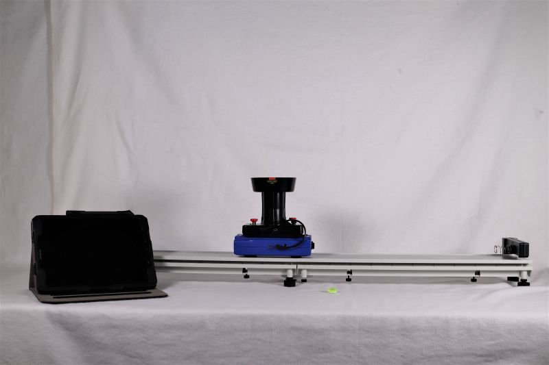 Der Ballistik-Aufsatz von PASCO wird über ein Klinkenkabel mit dem Smart-Cart verbunden. Über die Sparkview-App kann anschließend das Smart-Cart über Bluetooth mit einem Tablet verbunden werden. Für das Ballistik-Zubehör existiert ein eigenes Fenster, über das ein Timer eingestellt oder das Katapult direkt ausgelöst werden kann. Das Katapult wird aktiviert, indem man den Ball in die Öffnung nach unten drückt und somit eine Feder spannt. Für die Aufnahme kann es hilfreich sein, wenn das Raumlicht ausgeschaltet wird.