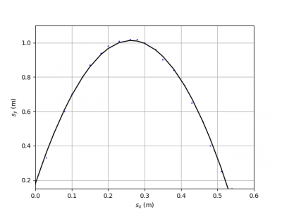 Fittet man die x-y-Flugkurve direkt in Viana.Net mit einer Parabel so erhält man eine Starthöhe von m, eine Geschwindigkeit in x-Richtung von und eine Geschwindigkeit in y-Richtung von .