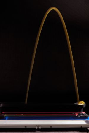 - Die PASCO-Farbahn wird auf einer möglichst dunklen Decke platziert, damit die Tische kein Licht reflektieren. Außerdem neigen weiße Flächen bei einer Langzeitbelichtung zum Ausbrennen, sodass dort keine Struktur mehr zu finden ist. Ein dunklen Hintergrund sollte verwendet werden.