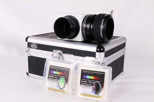 Sonnenfilter zur Beobachtung der Sonne auf der H-Alpha-Linie. Der Filter ist einem Zenitspiegel eingebaut. Der Blockfilter ist laut Herstellerangaben nur in Kombination mit dem H-Alpha-Etalonfilter zu verwenden.