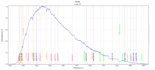 Flusskalibriertes Spektrum des Sterns Deneb mit Absorptionslinien.