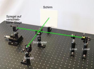 - Falls trotz Anpassung der Armlängen die Abbildung auf dem Schirm so klein ist, dass sich das Zählen der Hell-Dunkel-Hell in den weiteren Versuchen als schwierig erweist, kann eine zweite Linse zwischen Strahlteiler und Schirm eingebaut werden.